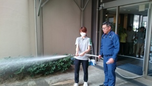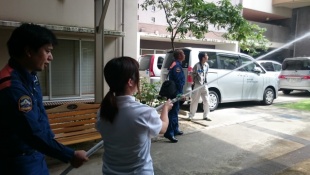 水消火器の後は、消火用散水栓のホースを使用した消火訓練を行いました。