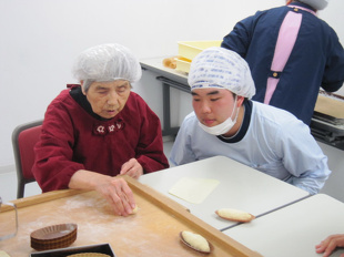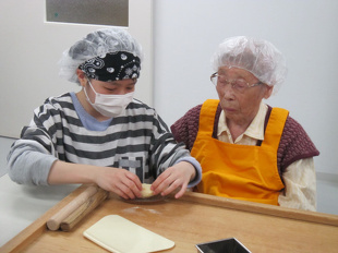 パン作りは活動センターの利用者とグループホームの入居者がペアになって、協力しながらおこないます。