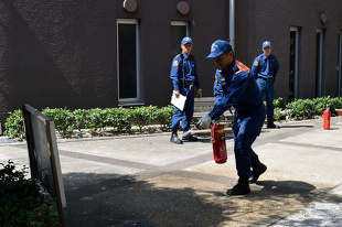 直上階の入居者を全員、隣の棟へ避難誘導させたところで消防隊が到着し、避難誘導訓練が終わります。