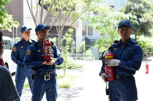 消防隊員がお手本を見せてくれた後は、スタッフが実際に水消火器を使用して消火訓練を行いました。