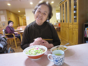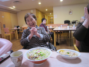 入居者の皆さんは、スタッフが食べる麺類に興味津々です。