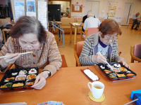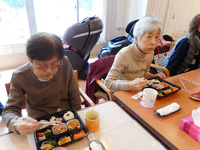 当初の計画では、春ドライブで見晴らしの良い展望台に行き、現地でお弁当を食べる予定でしたが、風がとても強く現地でお弁当を食べるのは断念してデイの室内で食べました。
