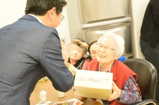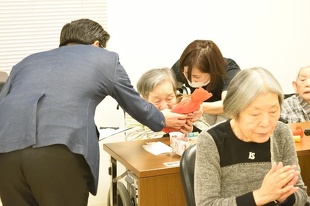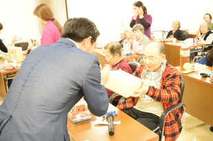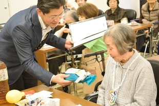 皆さんの歌が終わると、審査員の審査が行われ、審査員長の鮫島総施設長から商品が渡されました。