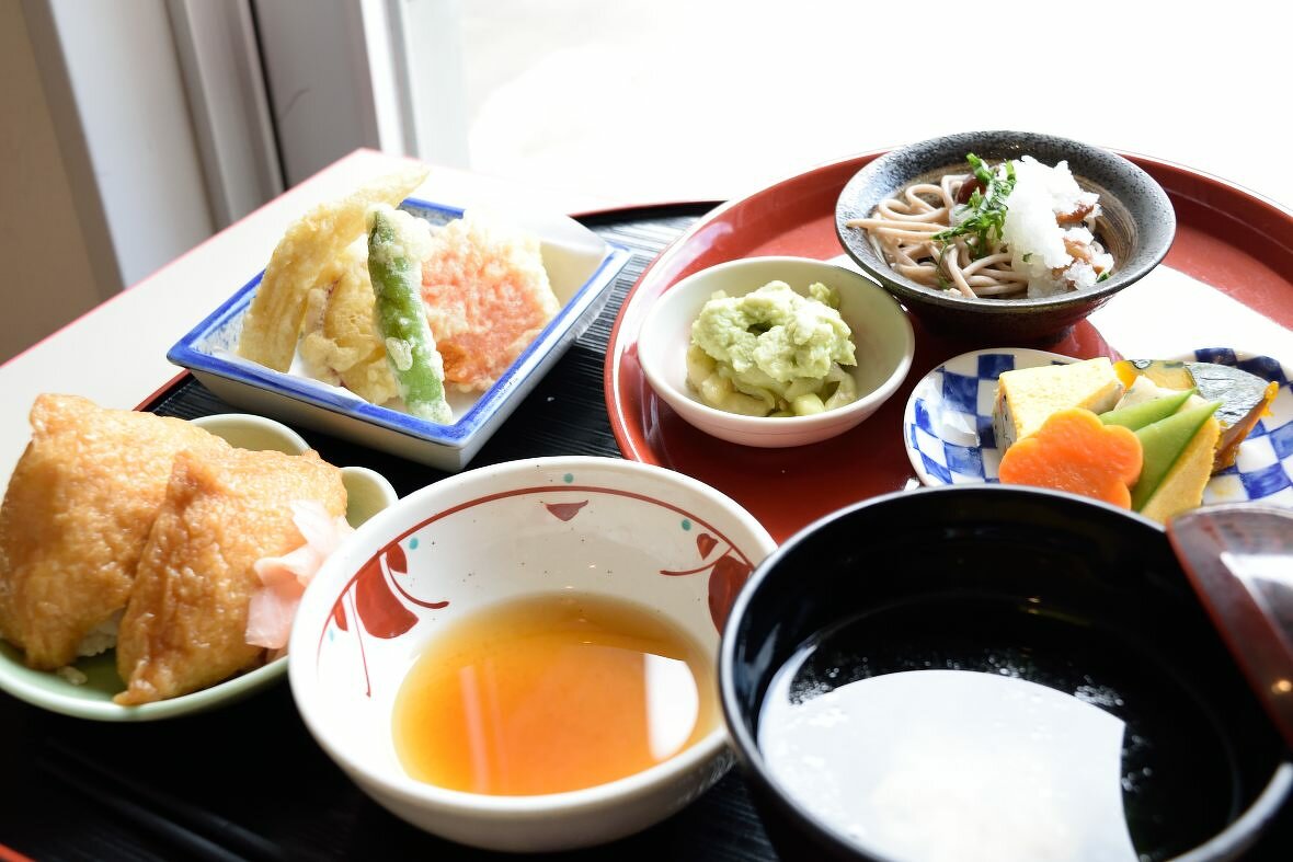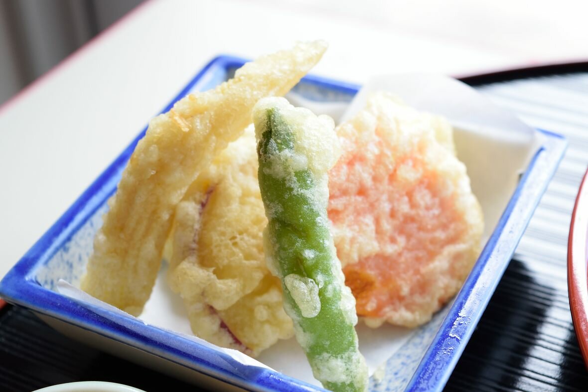 精進料理 今日、8月15日のお昼に、精進料理が提供されました。 精進料理のメニューは、 ・いなり寿司 ・精進揚げ(さつま芋、ヤングコーン、れんこん、人参、ししとう) ・おろしそば ・炊き合わせ(京合わせ、南瓜、絹さや、人参) ・茄子のずんだ和え ・清汁(ふんわり花型豆腐) でした。 戸畑では先ほど雷とすごい雨が降ってました。 最近の雨は、お隣の区では全く降ってないことがあり、びっくりします。 まだまだ暑い日が続きそうですね。 どうかご自愛ください。