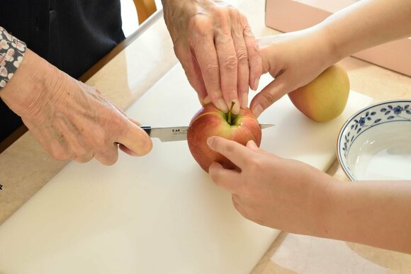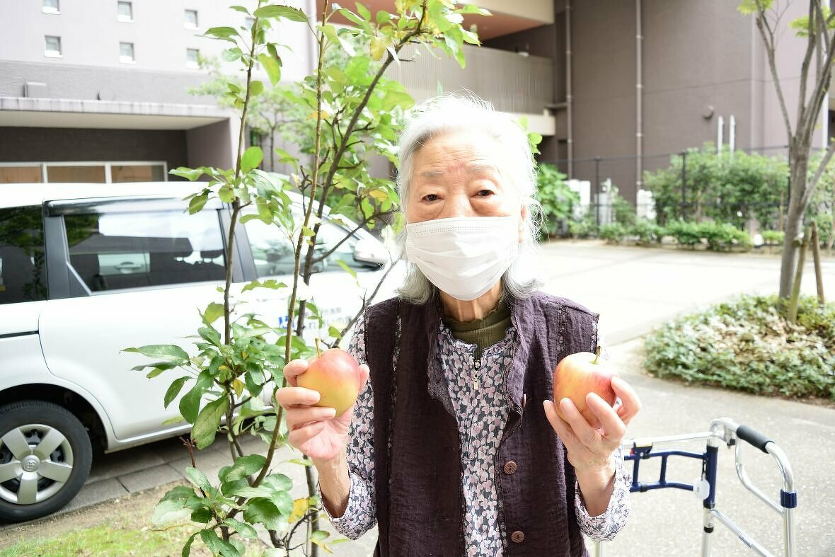 そこで、昨日、ケアハウスの入居者の方にお願いして、りんごを収穫していただきました。