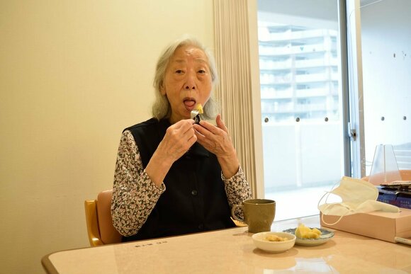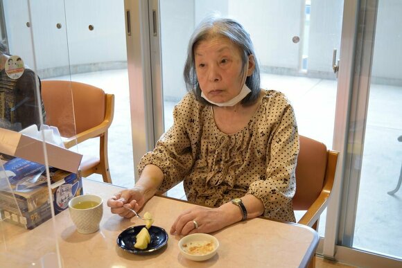そして、冷蔵庫で冷やした後、収穫していただいたご利用者に切ってもらい3時のおやつと一緒に食べてもらいました。